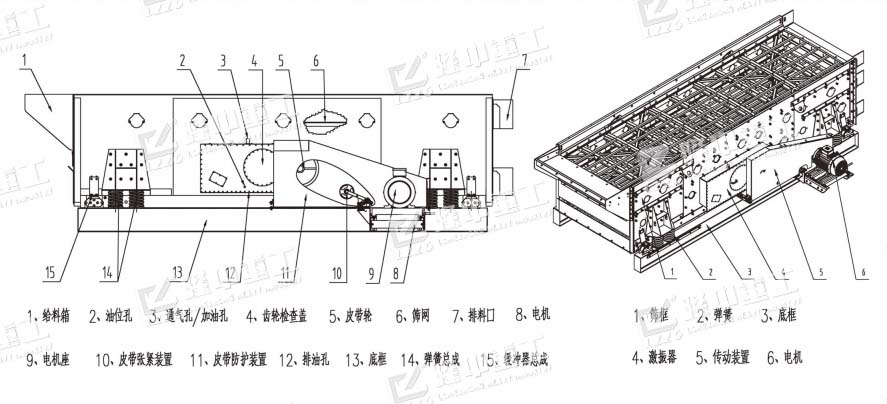 以三軸塊偏心激振器為激振源,以橡膠支承彈簧為彈性元件,以篩箱激振器等為可動(dòng)部分的篩分設(shè)備。其振動(dòng)器的三根軸上裝有相等偏心質(zhì)量、相同偏心半徑的配重塊。動(dòng)力由電機(jī)經(jīng)皮帶傳遞至主動(dòng)軸,再經(jīng)速比為1的齒輪進(jìn)行傳動(dòng),使三根軸同速旋轉(zhuǎn),從而產(chǎn)生激振力,使篩箱作強(qiáng)制連續(xù)的橢圓運(yùn)動(dòng)。物料以此運(yùn)動(dòng)為動(dòng)力,在水平的篩面上沿圓周方向作不斷的拋擲運(yùn)動(dòng),在拋起松散分層的同時(shí)向前運(yùn)動(dòng),周而復(fù)始地完成粒度分級(jí)和向前輸送的過程。
