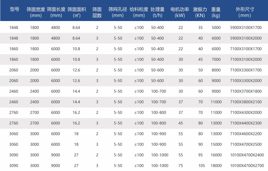 3、三軸橢圓振動(dòng)篩結(jié)構(gòu)可靠、激振力強(qiáng),篩分效率高、重心低等特點(diǎn)。